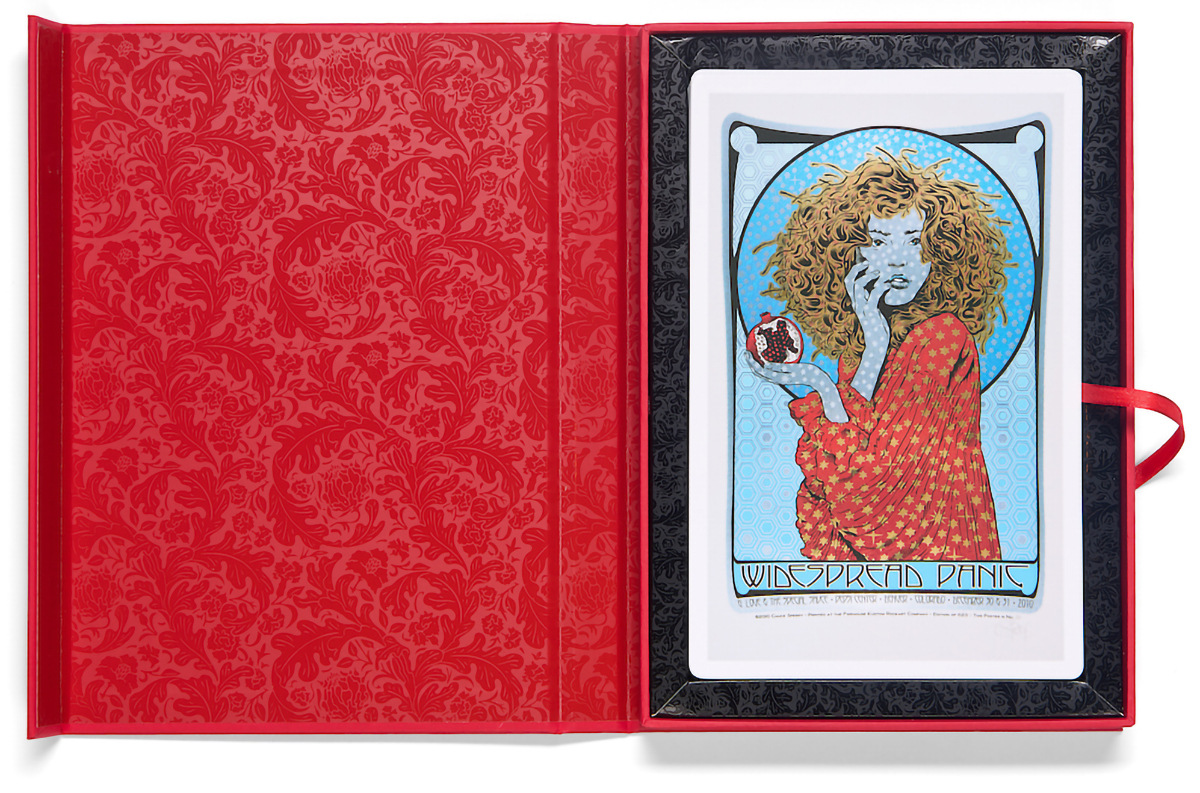The set comes in a gorgeous fire red, smooth, sturdy portfolio fold box with a secure magnetic snap closure. Title and signature is in gold emboss. The inside cover is gloss printed with a beautiful floral pattern over red, as is the black bumper which snugly cradles the deck of poster cards. A red ribbon aids access to the sealed deck of 25 cards.