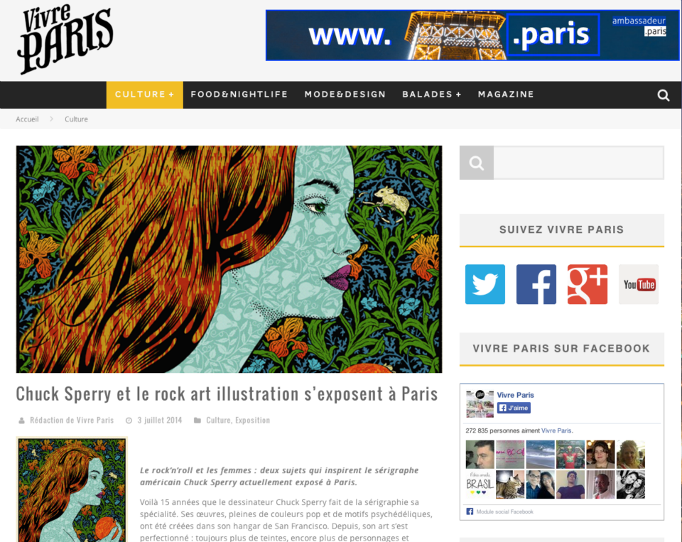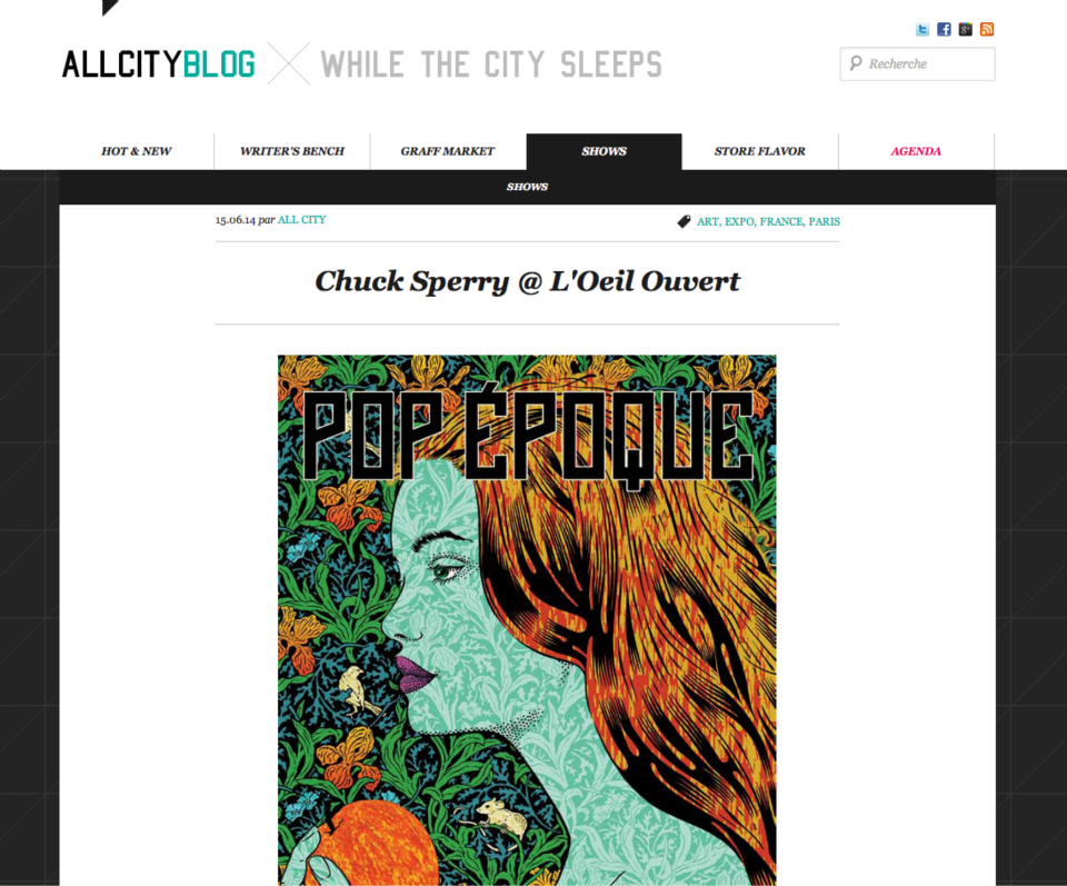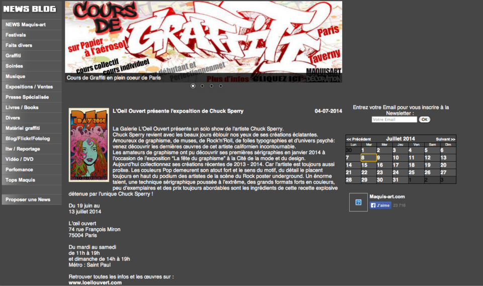 Opening: Thursday, June 19, 2014, l’Oeil Ouvert Gallery of Paris will debut a special month long solo exposition of Chuck Sperry’s poster art. The opening night reception and party that is free and open to the public. The show will be on view to the general public until July 13.