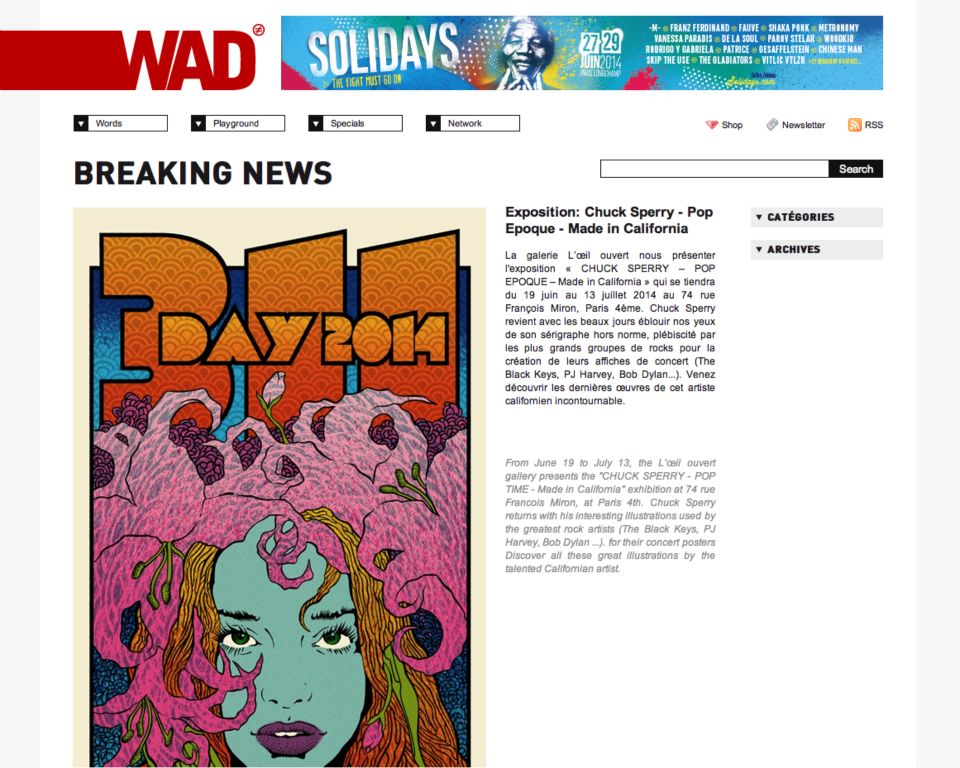 Chuck Sperry’s show called “Pop Époque” at l’Oeil Ouvert will open on June 19 and run until July 13, 2014. This will be a large showing of Chuck Sperry posters from his archive, which were originally released from the middle of 2013 to the beginning of June 2014, with some older posters included. Many of Sperry’s newest limited edition silkscreened concert posters will be available, rare and hard-to-acquire posters will be made available through l’Oeil Ouvert for the occasion!